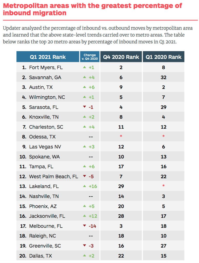 « Il a été fascinant de voir les schémas de migration s’éloigner des villes et se diriger vers des climats plus chauds pendant la pandémie », déclare David Greenberg, fondateur et PDG de Updater. « Avec les vaccinations en cours, la levée des restrictions dans certaines de nos villes les plus durement touchées et les entreprises qui déploient des solutions de travail hybrides permanentes, nous anticipons une saison estivale de déménagement qui ne ressemblera à aucune autre, avec une série de nouveaux modèles atypiques. »