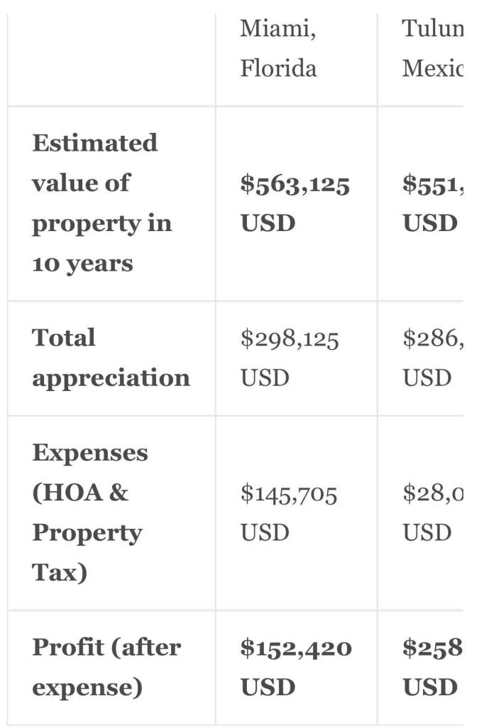 Sur une période de 10 ans, vous réalisez 51,52% de bénéfices en plus sur votre propriété à Tulum Mexico par rapport à Miami, Floride.